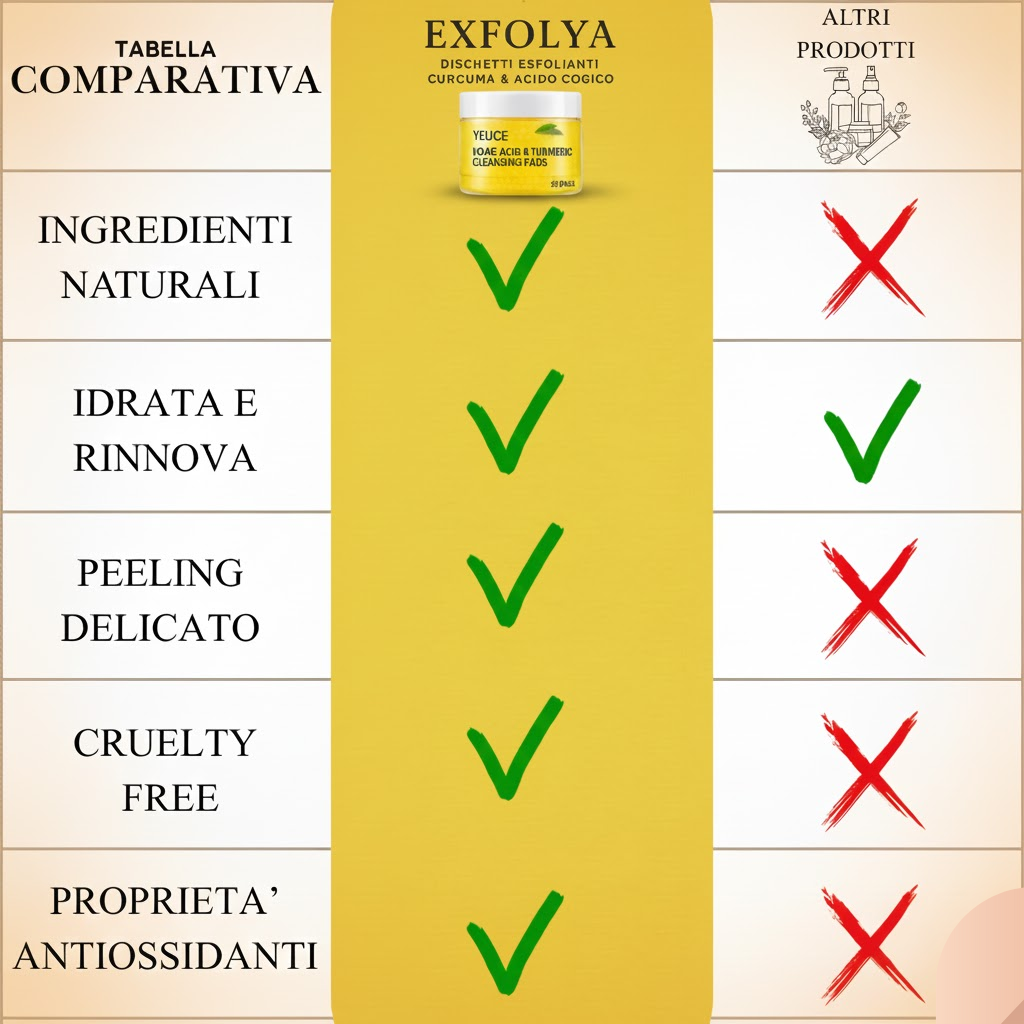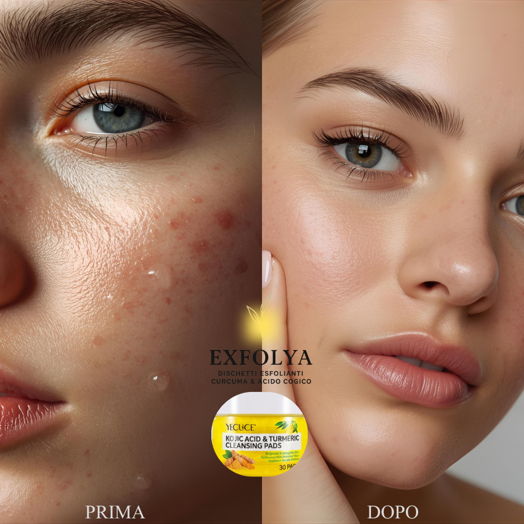 Scopri il potere della natura con i nostri dischetti esfolianti alla curcuma e acido cogico. Una formula innovativa che combina ingredienti naturali per donare alla tua pelle luminosità e uniformità senza precedenti.